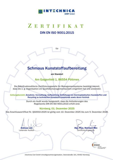 Rohstoffe für die Kunststoffindustrie sind wertvoll - Schmaus Kunststoffaufbereitung unterstützt Sie dabei, diese wertvollen Ausgangsmaterialien kostenoptimal zu nutzen. Wir übernehmen Produktionsausschuss aus Überproduktionen, Anfahrprozessen oder Fehlchargen sowie Retouren. Dabei gehen wir auch mit Kunststoffen um, die in der Vermahlung besonders anspruchsvoll sind, wie zum Beispiel Verbundmaterialien. Im Rahmen der Kunststoffaufbereitung gestalten wir genau definierte, qualitätsgesicherte Aufbereitungsprozesse zum Reinigen, Sortieren und Trennen. Im nächsten Schritt des Kunststoff-Recyclings produzieren wir Mahlgut in definierten Korngrößen. Je nach Erfordernis können Sie das Mahlgut an dieser Stelle wieder in Ihre Produktion übernehmen. Oder wir führen die Aufbereitung weiter und produzieren Regranulate und Recompounds in genau der Qualität, Farbe und Größe, die Sie benötigen. Qualitätszertifiziert nach DIN 9001, kostengünstig und just-in-time geliefert.